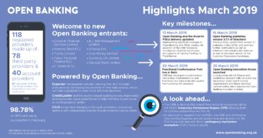 Download Open Banking March Highlights (PDF) 118 regulated providers made up of 78 third party providers and 40 account providers, with 23 regulated entities that have at least one proposition live with customers. Commenting on the March highlights for Open Banking, Trustee of the OBIE, Imran Gulamhuseinwala OBE said: “Significant changes took place in March in relation to Open Banking as we further supported participants on their journey to PSD2 compliance. At the same time, we saw a steady pipeline of businesses adopting our Standards and new, innovative technologies appearing from both third party providers and the more established industry players.” Welcome to new Open Banking entrants Creation Financial Services Limited, Investec Bank PLC, Trutify Limited, Tesco Personal Finance, C. Hoare & Co, A J Bell Management Limited, Streeva Ltd, Oval Money Limited, Currency UK Limited, Vanquis Bank Limited Open Banking Key Milestones 13 March: Open Banking and the Road to PSD2 delivery updated 15 March: Open Banking publishes version 3.1.1 of Standard 20 March: Functional Conformance Tool live in Beta 25 March: Open Banking Innovation forum launched Powered by Open Banking Experian has targeted radically reducing the UK’s ‘Invisible’ population by harnessing the potential of new data sources, which can help organisations make more informed decisions. CreditLadder and the world’s largest building society, Nationwide Building Society, have joined forces to help first-time buyers move on to the property ladder. Circit brings Open Banking to the audit profession, connecting auditors with independent sources of audit evidence held by banks. Information correct as at 31 March 2019. Produced by Open Banking Implementation Entity (OBIE). – – – ENDS – – – For further information, please contact: press@openbanking.org.uk About Us Open Banking is a new, secure way for customers to take control of their financial data and share it with organisations other than their banks. Open Banking has the power to revolutionise the way we move, manage and make more of our money. For businesses, it is about making the management of cashflow and receiving payments cheaper and easier. Open Banking will make things simpler, faster and more convenient. Open Banking follows the Competition and Markets Authority (CMA) investigation into the supply of personal current accounts (PCAs) and of banking services to small and medium-sized enterprises (SMEs). Open Banking was created to enable innovation, transparency and competition in UK financial services. It is tasked with delivering the Application Programming Interfaces (APIs), data structures and security architectures that will enable developers to harness technology, making it easy and safe for individuals and SMEs to share the financial information held by their banks with third parties. Open Banking will bring substantial benefits. It gives customers and SMEs greater market choice and greater control over their money and associated data, along with better and easier access to new financial services providers in a secure environment. Notes to Editors: 1. Open Banking Ltd was set up by the Competition & Markets Authority (CMA) in September 2016 to fulfil one of the remedies mandated by the CMA following an investigation into UK retail banking. 2. The CMA’s investigation into the retail banking market (whose findings were published in August 2016) concluded that older and larger banks do not compete hard enough for customers’ business and that Open Banking should deliver a new, secure option for customers to be able to compare the deal they are getting from their bank. 3. Open Banking was created to enable innovation, transparency and competition to UK financial services. It is tasked with delivering the Application Programming Interfaces (APIs), data structures and security architectures that will make it easy and safe for customers to share their financial records by January 2018. 4. The data provided by Open Banking will enable developers to harness technology that allows individuals and businesses to share their financial records held by their banks with third parties. 5. Open Banking is a private body; its governance, composition and budget was determined by the CMA. It is funded by the UK’s nine largest current account providers and overseen by the CMA, the Financial Conduct Authority and Her Majesty’s Treasury. 6. The 9 mandated institutions (referred to as the CMA9) are: Barclays plc, Lloyds Banking Group plc, Santander, Danske, HSBC, RBS, Bank of Ireland, Nationwide and AIBG.